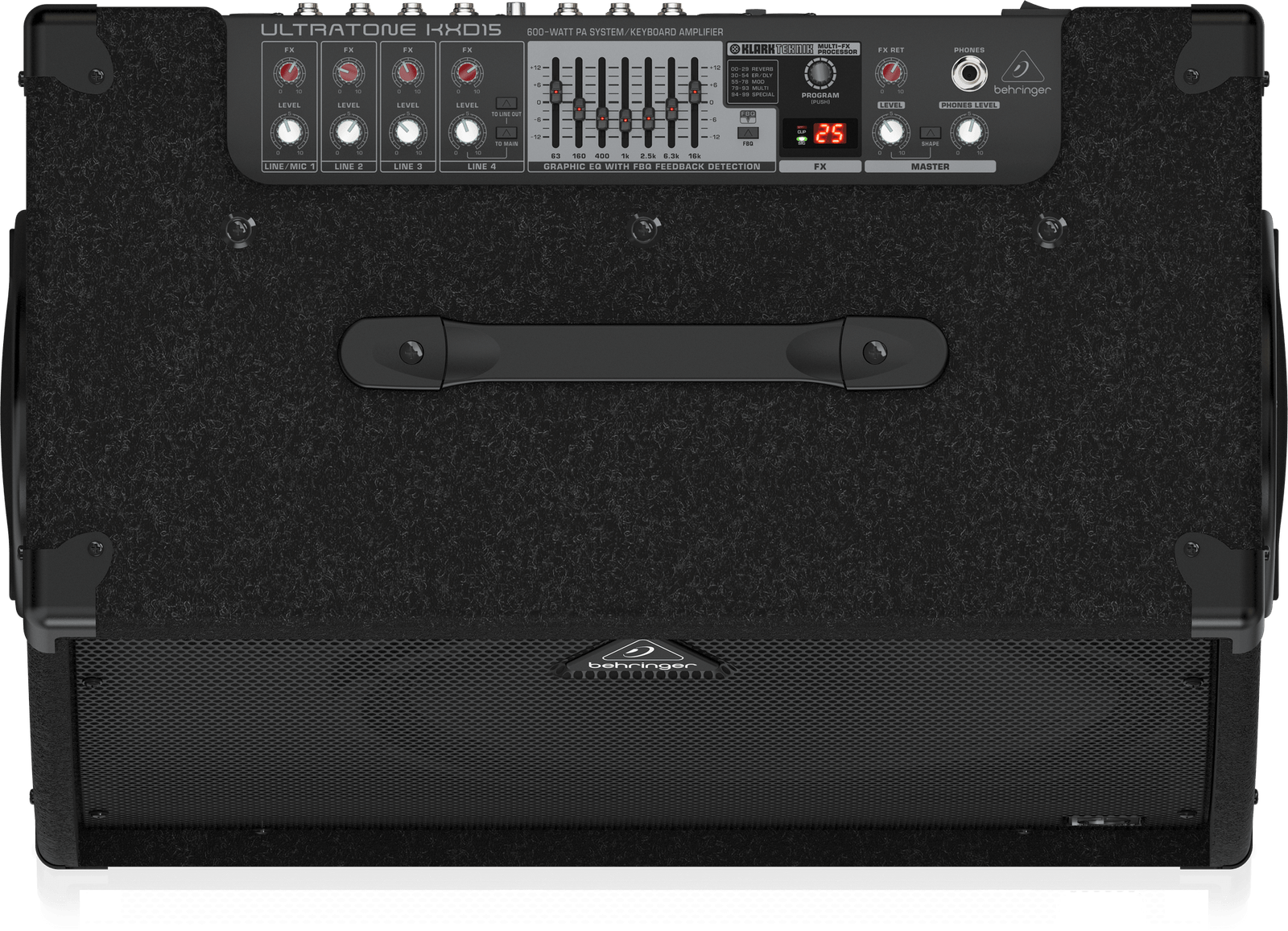 El increíblemente potente ULTRATONE KXD15 destaca como un amplificador extraordinariamente versátil para teclados y batería, además de un sistema de megafonía (PA) de 4 canales de alta calidad, con un altavoz TURBOSOUND de 15″ de primera categoría, todo ello en un formato compacto y fácil de transportar. Especializado en un sonido rico y preciso, y con características profesionales como un procesador multiefectos KLARK TEKNIK con calidad de estudio, un diseño biamplificado real y nuestro ecualizador gráfico de 7 bandas FBQ, este robusto amplificador de 600 vatios sacará el máximo partido a tus instrumentos y voces en cada concierto.