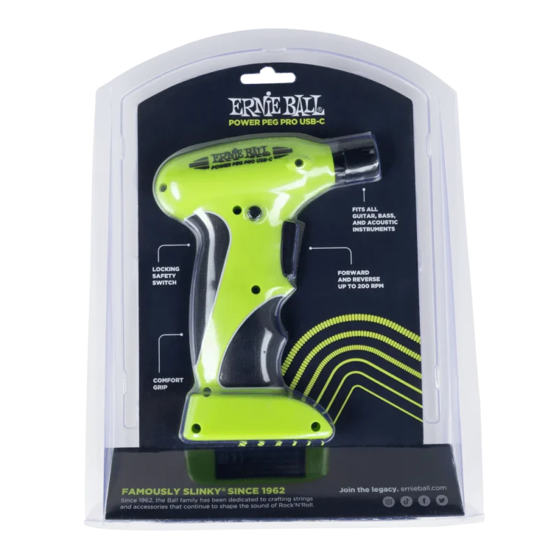El Ernie Ball Power Peg Pro USB-C cuenta con un cabezal universal para la mayoría de los clavijeros de guitarras acústicas, bajas y eléctricas. Ofrece un par de torsión superior y es compatible con todos los requisitos de tensión, desde mandolinas hasta ukeleles y bajos vintage. El Power Peg Pro reencorda tu instrumento hasta un 80 % más rápido que los afinadores manuales. Además, la batería recargable de iones de litio y el cable de alimentación USB-C de carga rápida (incluido) hacen que comprar pilas sea cosa de