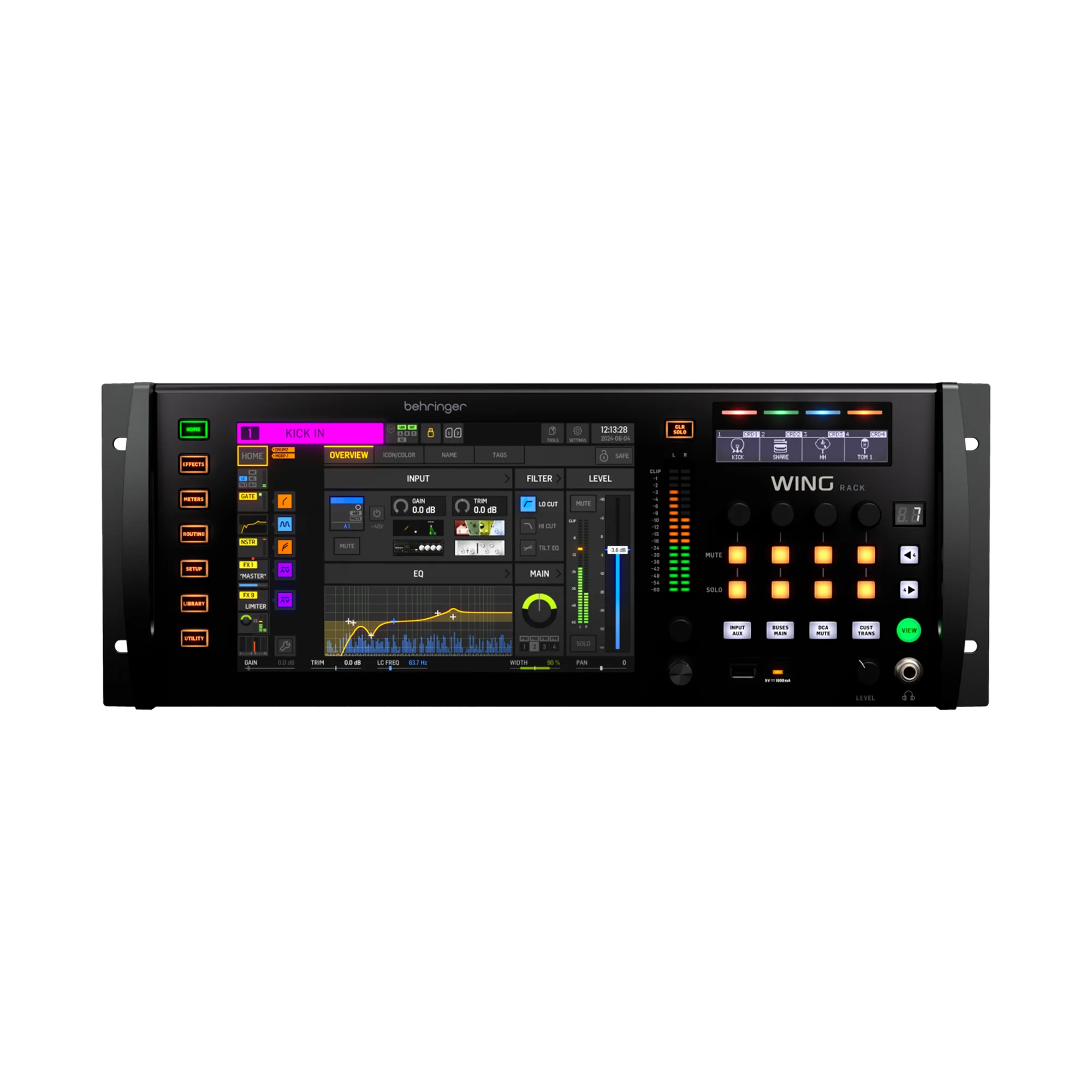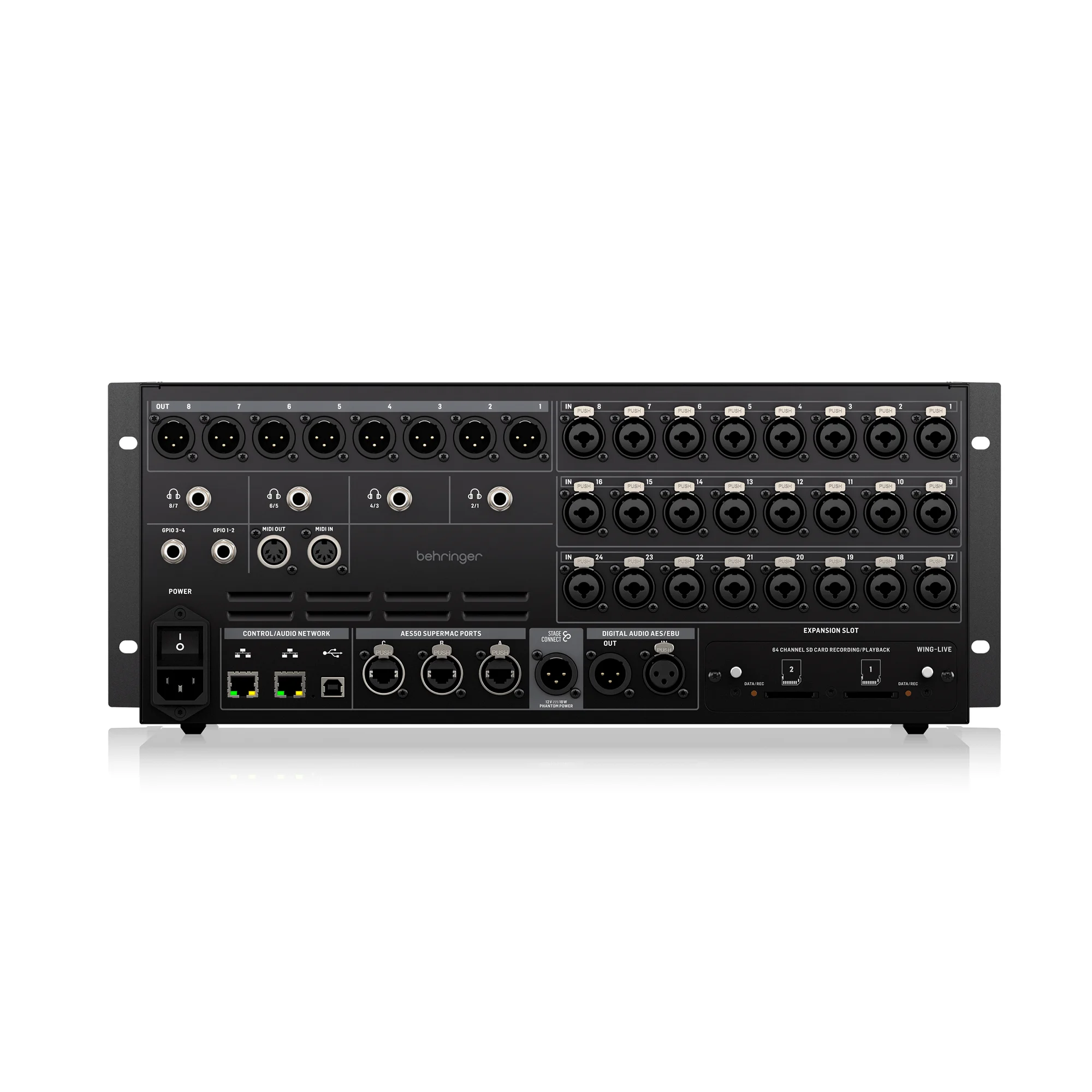 La BEHRINGER WING RACK es un potente motor de mezcla digital en formato rack, con 48 canales de entrada, 28 buses estรฉreo, 24 preamplificadores MIDAS PRO, 8 salidas XLR y pantalla tรกctil de 10,1โ. Perfecta para giras, estudios e instalaciones profesionales.