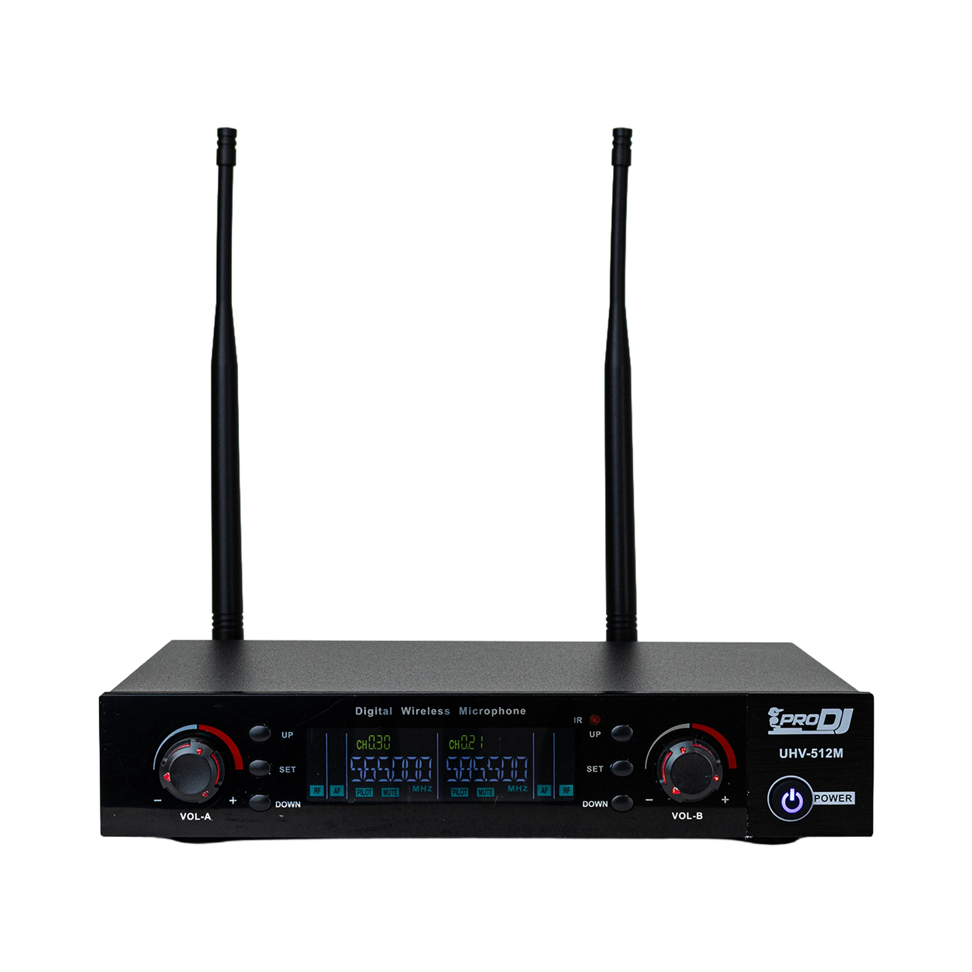 El sistema inalámbrico doble de mano PRO DJ UHV-512M de PRO DJ es ideal para eventos, iglesias, conferencias y presentaciones en vivo. Opera en banda UHF con frecuencia variable seleccionable y hasta 100 canales disponibles para evitar interferencias y asegurar señal estable.